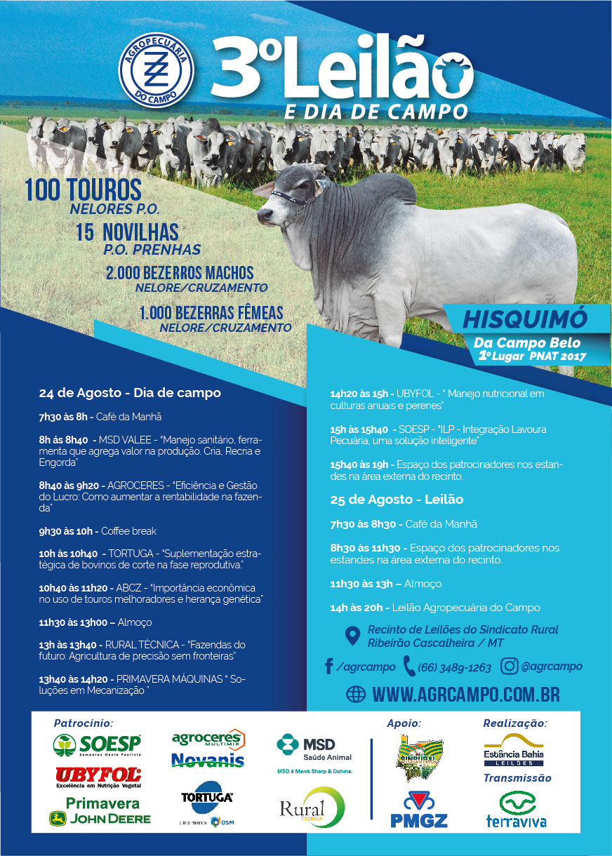 O 3º Leilão e o Dia de Campo serão realizados nos dias 24 e 25 de agosto no Recinto de Leilões do Sindicato Rural de Ribeirão Cascalheira – MT.