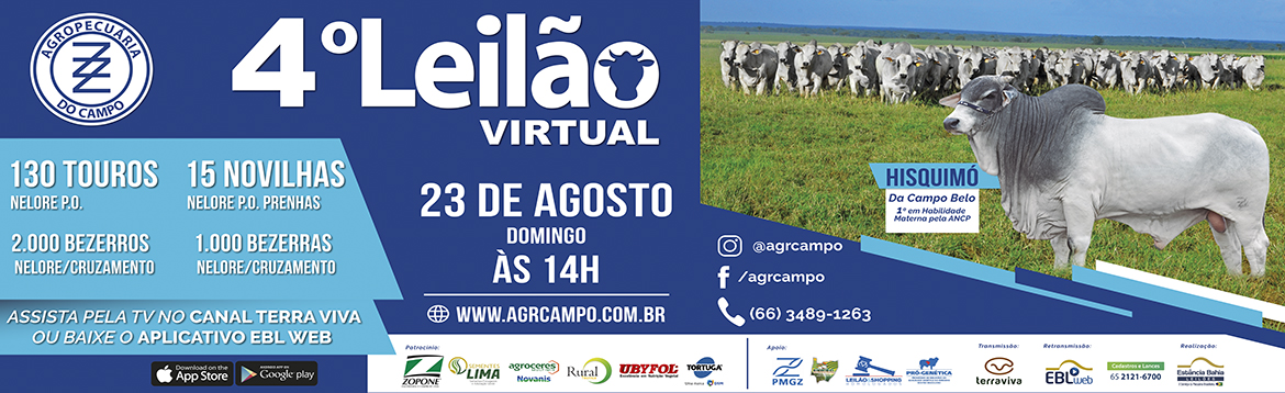 O 4º Leilão da Agropecuária do Campo de 2020 será realizado no dia 23 de agosto, domingo, às 14h, de forma virtual com transmissão pelo Canal Terra Viva e pelo aplicativo EBL WEB.