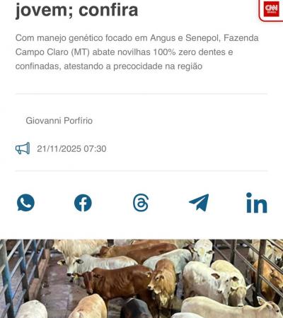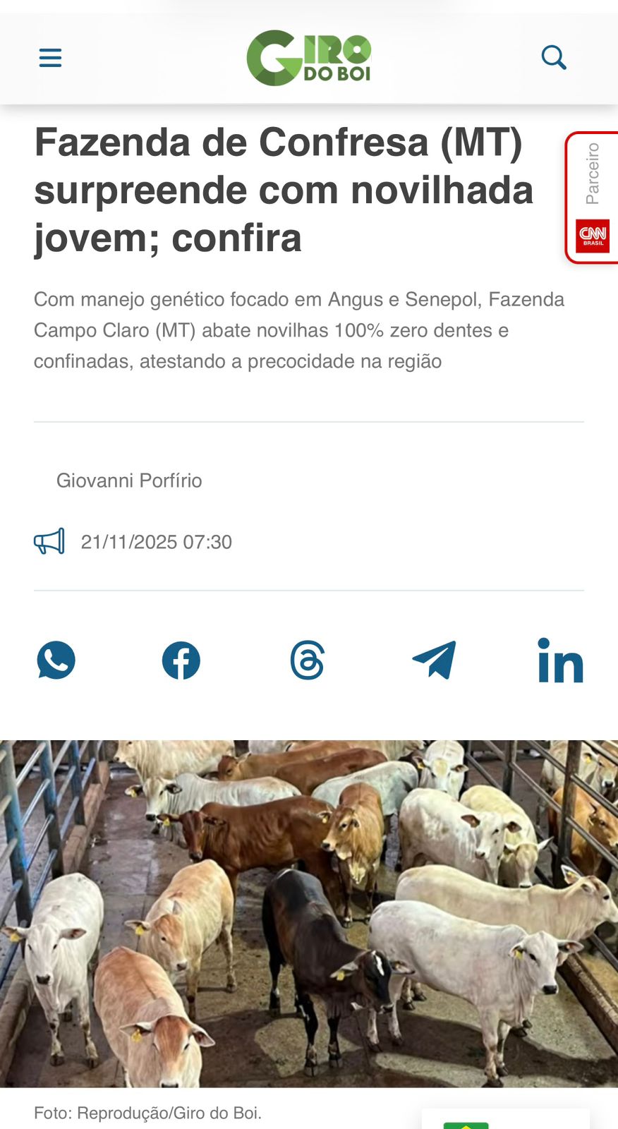 O site Giro do Boi, referência nacional em informação e conteúdo sobre a pecuária brasileira, publicou recentemente uma reportagem destacando a excelência das novilhas encaminhadas para abate por nossa propriedade. A matéria ressaltou o ótimo padrão dos animais da Fazenda Campo Claro, evidenciando a qualidade genética, o bom acabamento e o manejo adequado ao longo de todo o ciclo produtivo por serem novilhas jovens.