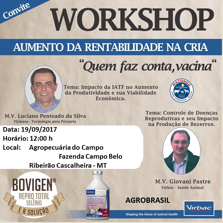 A AGR do Campo, em parceria com a Agrobrasil, convida os produtores da região a participarem do workshop que será realizado no dia 19 de setembro, na Fazenda Campo Belo, com o tema “Aumento da rentabilidade na cria de bovinos de corte”. O evento contará com palestras que exploram a utilização dessas tecnologias como ferramentas de manejo para incrementar a produção na propriedade.